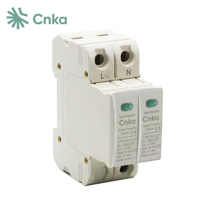 China Suppliers CNKA offers wholesale single-phase AC SPDs, including I+II, B+C, and T1+T2 types, featuring an Iimp of 12.5kA. These devices are designed to protect against indirect and low-intensity direct lightning strikes. In a standard three-phase TN-C power grid, they meet the requirements of LPL III and IV levels as specified in the EN 62305 standard, safeguarding electrical equipment from lightning current impacts.